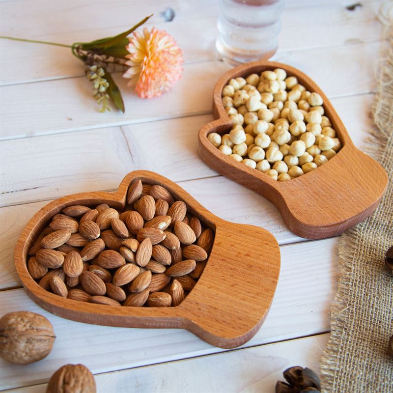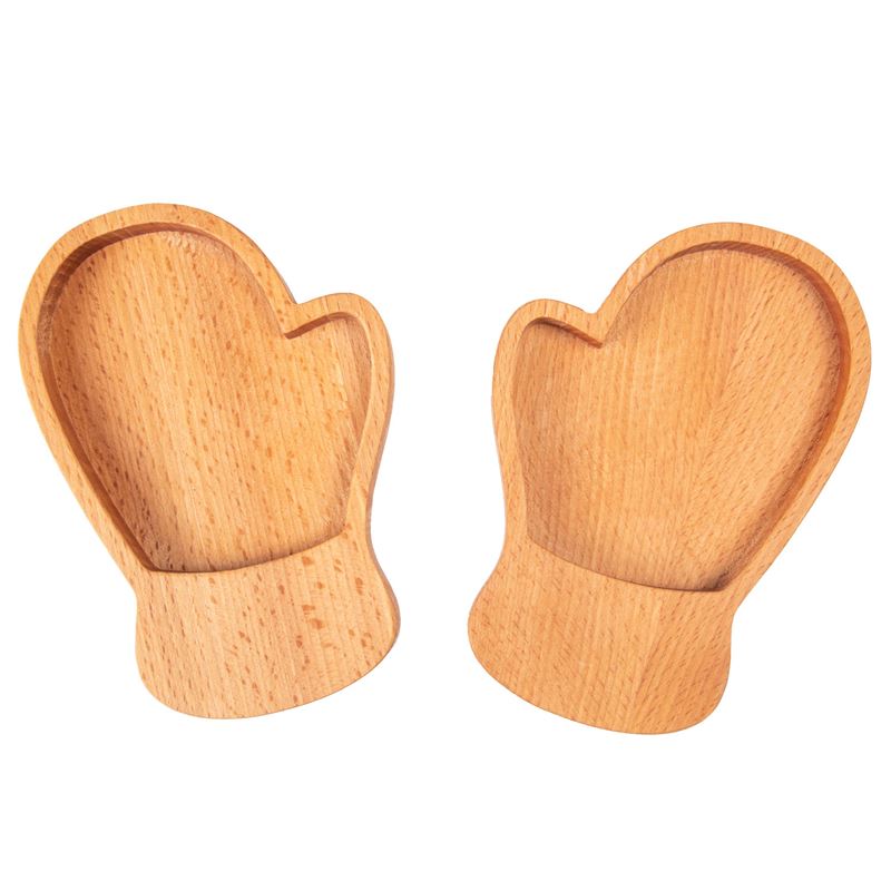 المنتج يتكون من اثنين من القفازات اليمنى وحامل ملفات تعريف الارتباط الخشبي المصمم على شكل قفاز أيسر.