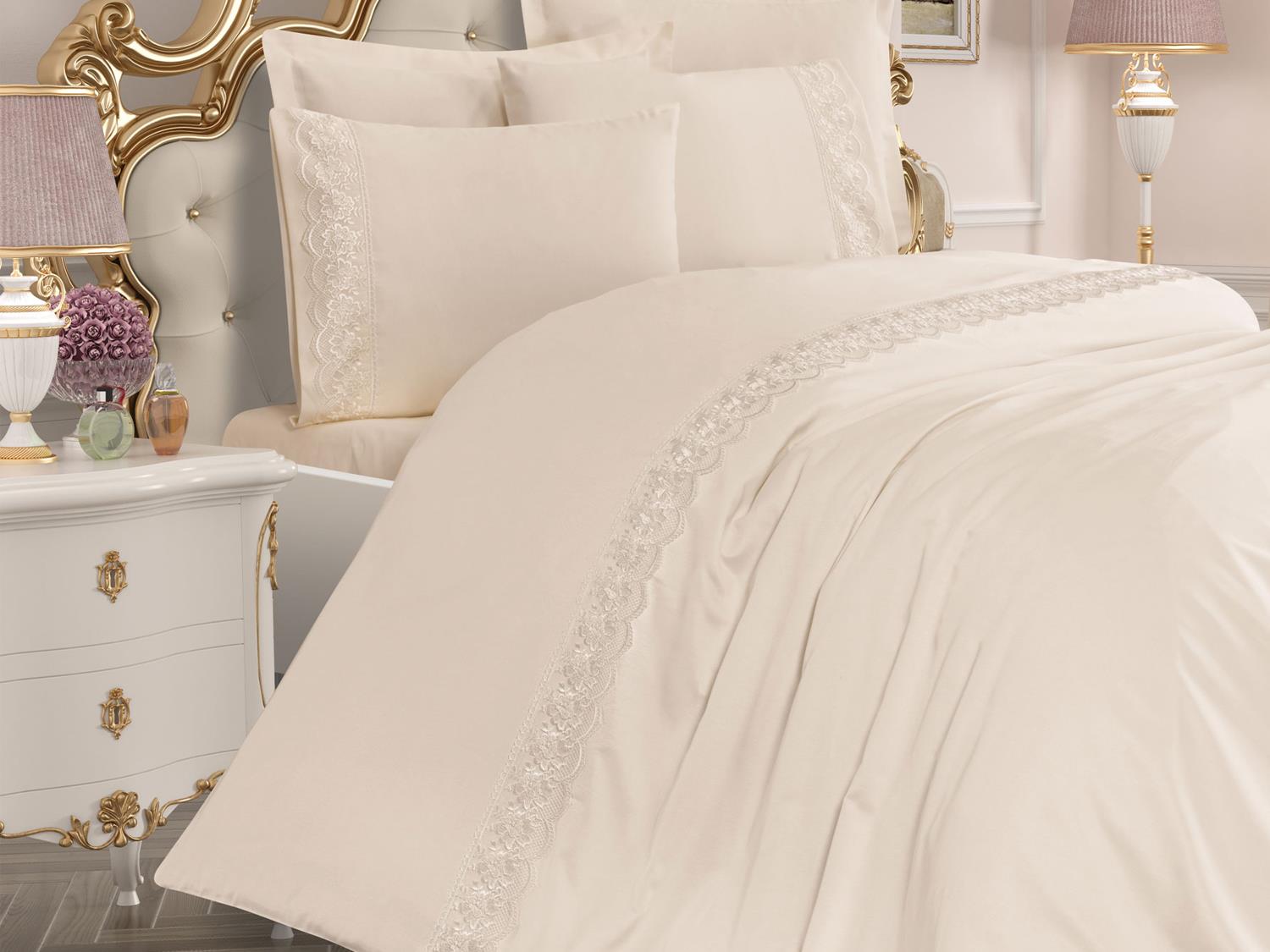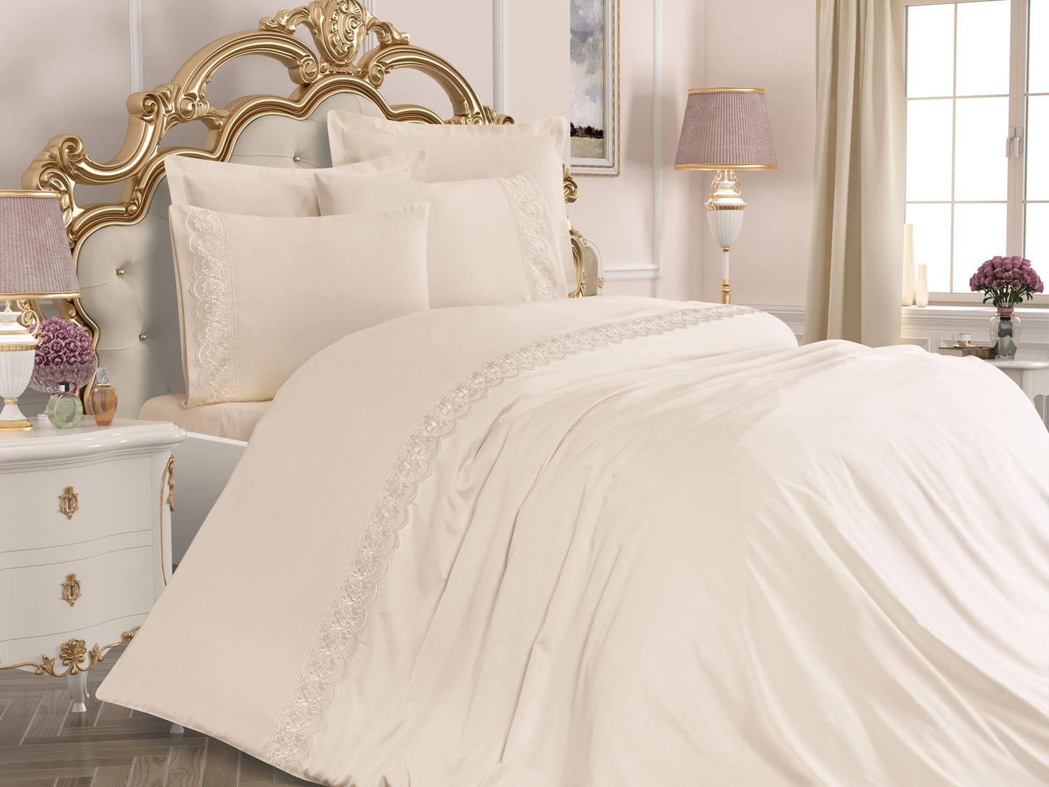 مصنوع من نسيج قطن 100٪. تم إنشاء تصميم خاص من خلال خياطة Guipure الفرنسية على حافة غطاء اللحاف.