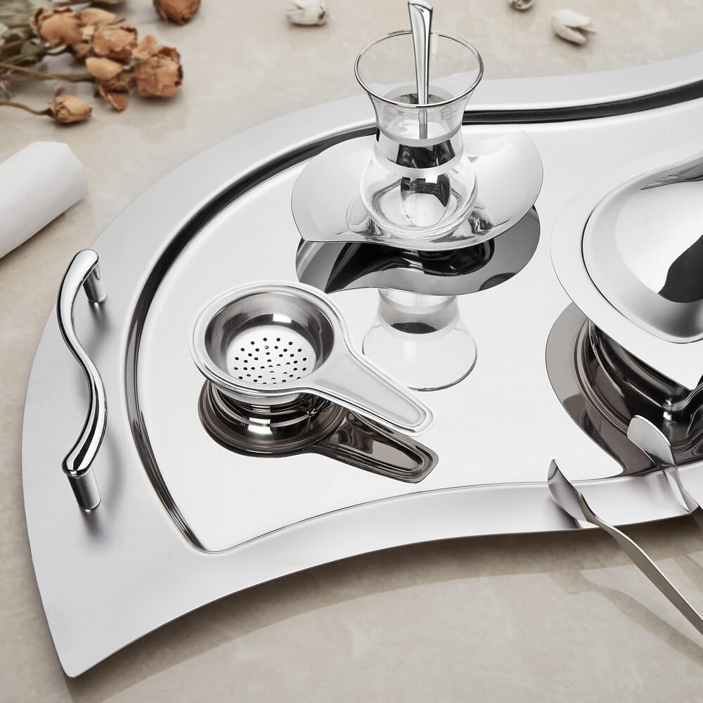 يمكنك استخدام طقم شاي الساتان الأنيق Gizem لمحادثات الشاي اليومية وطاولات دعوتك. يُعد السطح المصقول غير اللامع للصينية المتموجة والفولاذ اللامع مثل المرآة مثالية لعروضك التقديمية الملهمة. جميع أجزاء طقم شاي Gizem الساتان آمنة للغسل في غسالة الصحون.