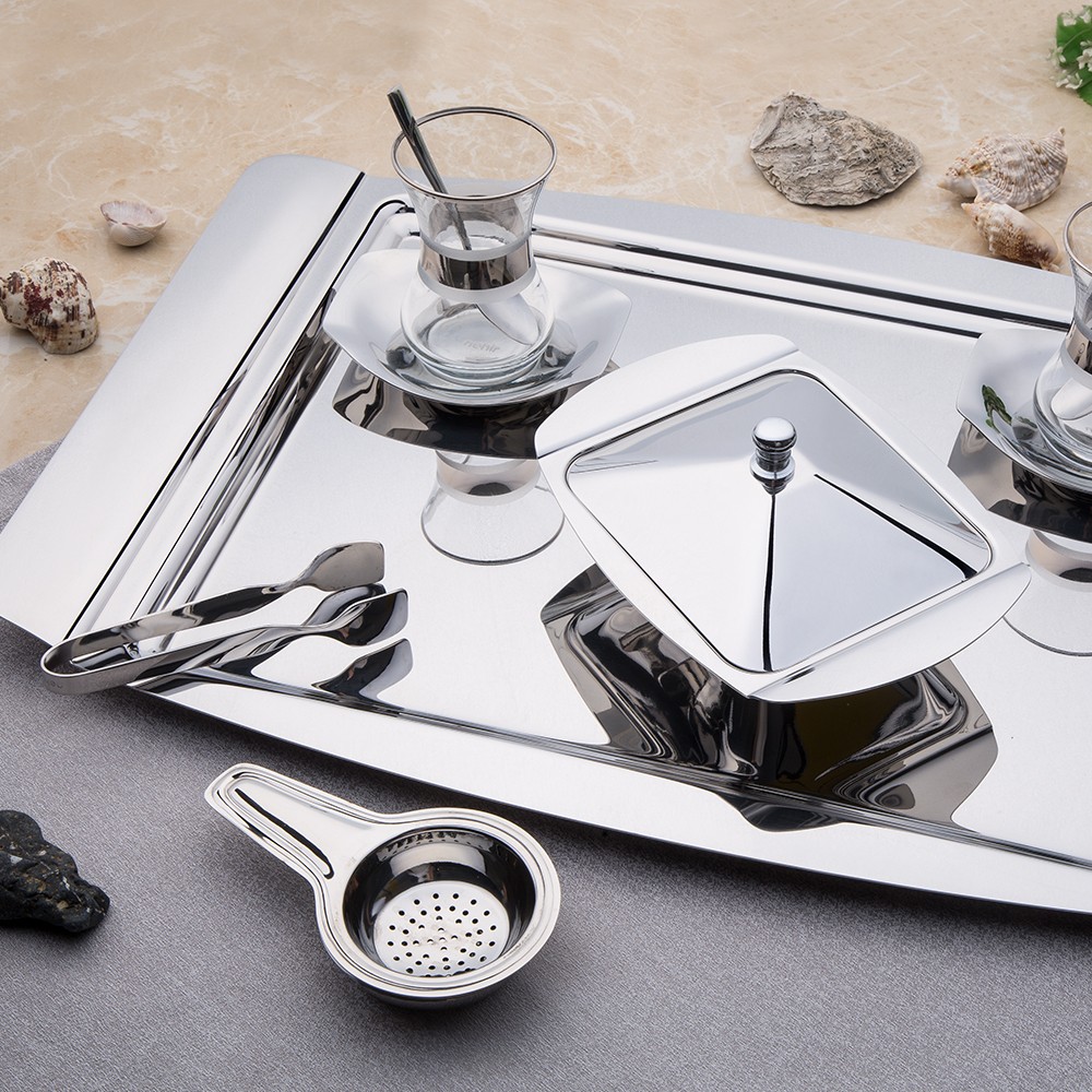 يمكنك استخدام طقم شاي الجندول الأنيق لمحادثات الشاي اليومية ولجداول دعوتك. يُعد الفولاذ اللامع الذي يشبه المرآة في درجه مثاليًا لعروضك التقديمية الملهمة. يمكن غسل جميع أجزاء طقم شاي الجندول في غسالة الأطباق.