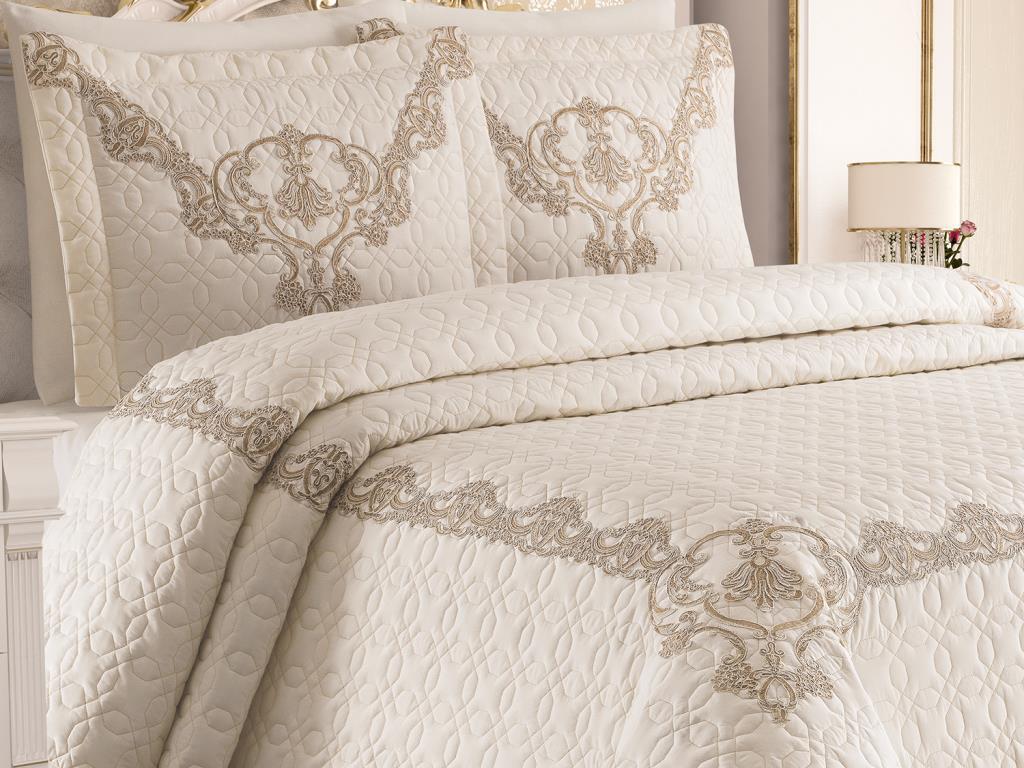 نسيج غطاء السرير من القطن. بالإضافة إلى ذلك ، تم إنشاء تصميم أنيق مع خياطة اللحف.