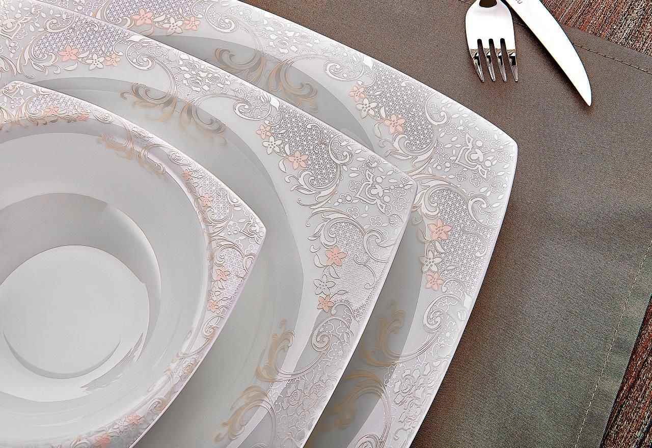 Boyutlar ve Teslimat: 1x Neva Bone Premium Kare Gümüş Süsleme 85 Parça Porselen Yemek Takımı | 12 Kişilik |