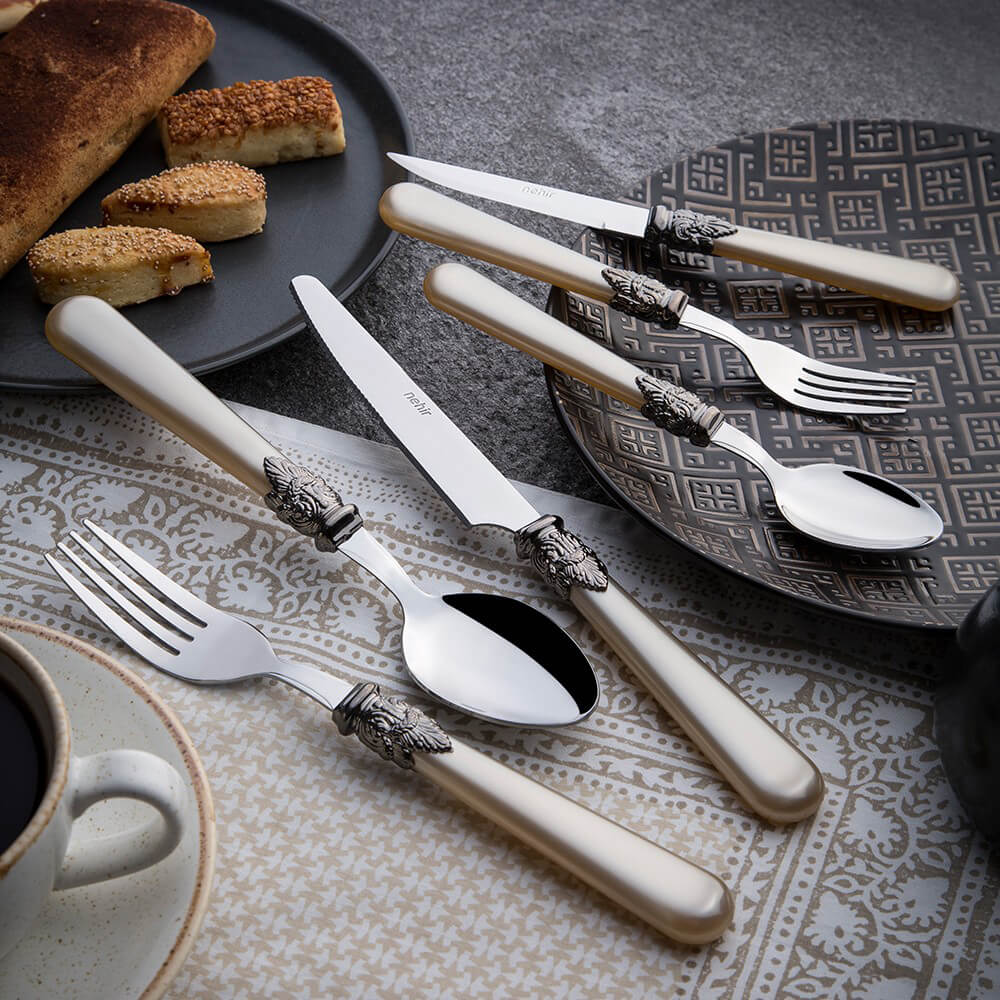 ستخلق أطقم أدوات المائدة العتيقة مظهرًا مختلفًا على طاولاتك بتصميمها الأنيق ... وستكون لا غنى عنها في عروضك التقديمية بفضل ميزتها غير القابلة للصدأ وهيكلها المتين ومظهرها المبهر ...