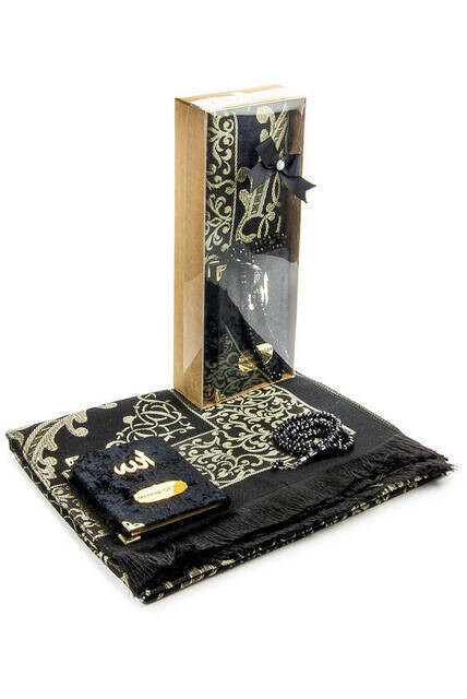 كتاب ياسين مخملي مغطى - حجم الجيب - لوحة الاسم - سجادة الصلاة - مسبحة - محاصر - لون اسود