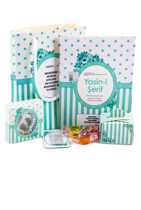 Yasin Set mit Namensschild - Beutelgröße - 64 Seiten - Rosenkranz - Magnet - Mit Zucker - Grüne Farbe - Mevlid Geschenk