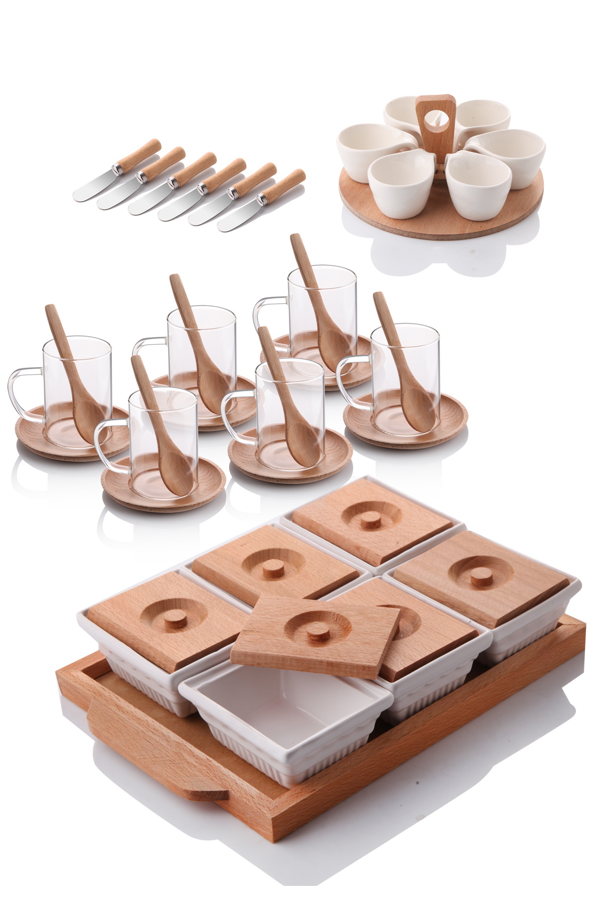 44 Stück natürliches Frühstücksset. Das Set enthält: 13 Stück Frühstück mit Holztablett und Deckel.; 18 Stück Teeservice Borasilikatglas-Teetasse (200 ml) 6 Stück, 6 hölzerne Teeteller, 6 Stück Große hölzerne Teelöffel. Alle Holzteile 1. Die weißen Teile bestehen aus Keramik 1. Klasse. Die Teetassen bestehen aus Borasilikatglas 1. Klasse.