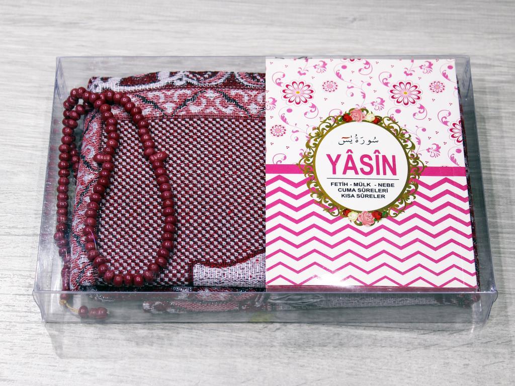 Der Gebetsteppich in unserem Produkt hat eine weiche Textur. Es enthält auch Yasin-i Şerif und einen Rosenkranz.
