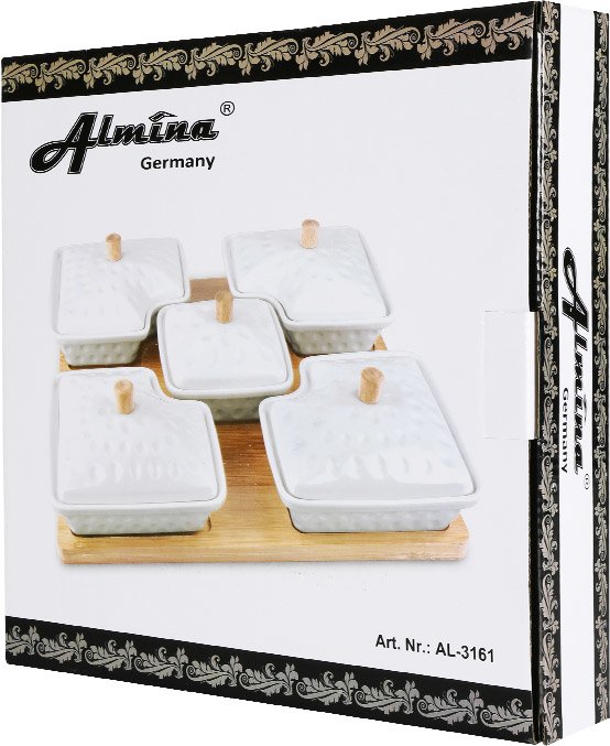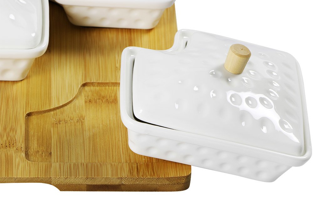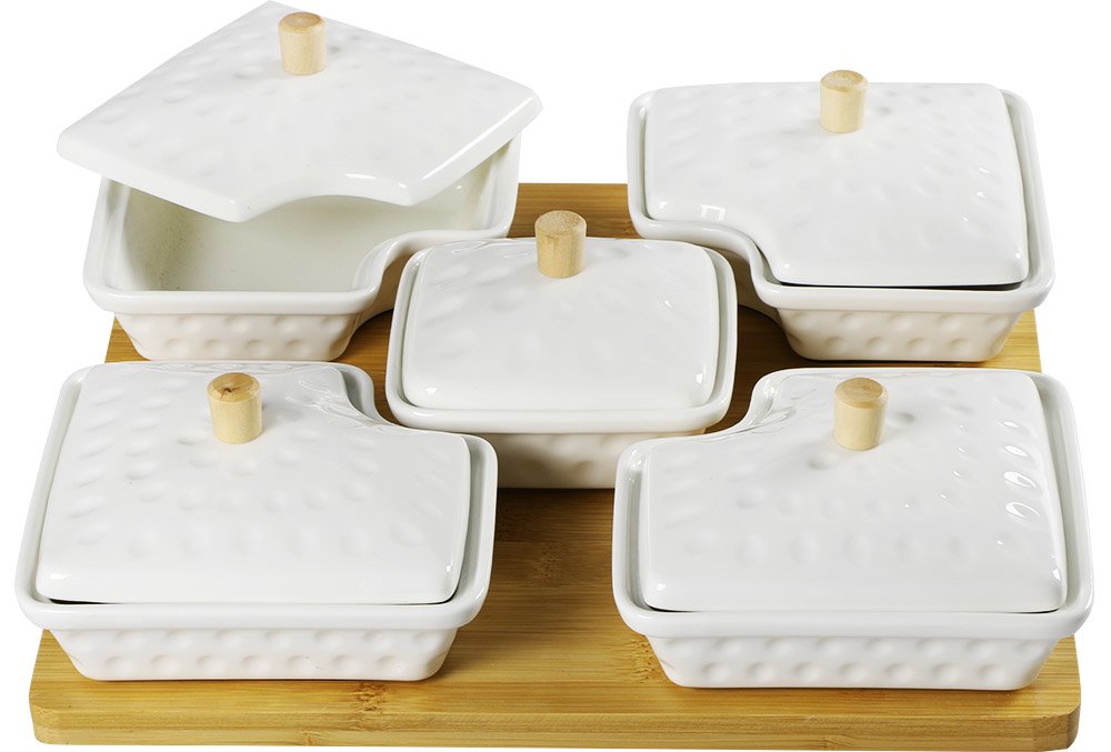 Lieferumfang und Abmessung: 1 x Almina Porzellan Snack- und Frühstücks Servierschüssel Set mit Bambus Tablett 11 Teilig | Weiß