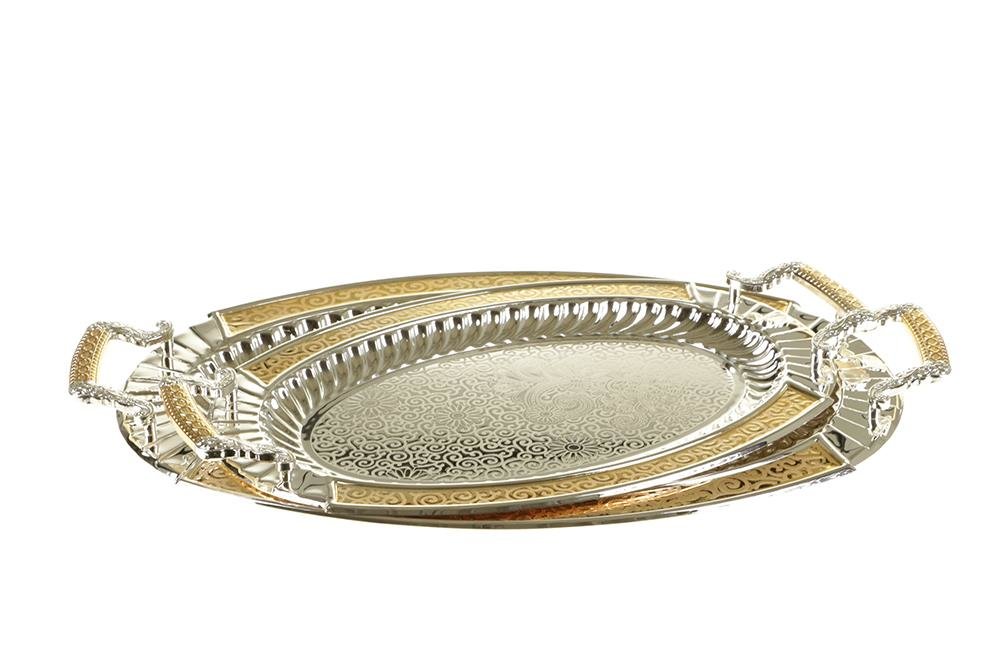 Artikelbezeichnung: Almina Serviertablett Elegant 2-tlg.-Set Gold mit graviertem Blumenmuster oval