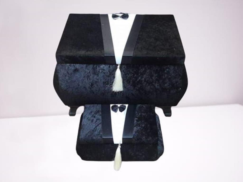 Ein spezielles Design wurde geschaffen, indem die Bräutigamfigur auf den Samtstoff gegeben wurde.