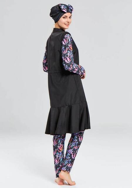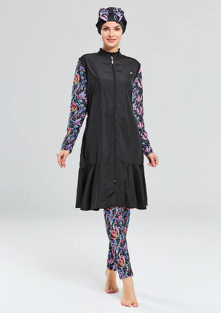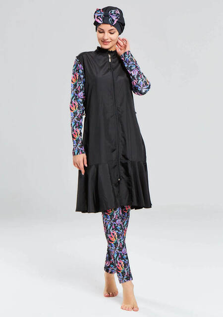 - Kollarında ve pantolonunda renkli yaprak desenleri ve bonesinde fularıyla dikkat çeken tam kapalı tesettür mayo.