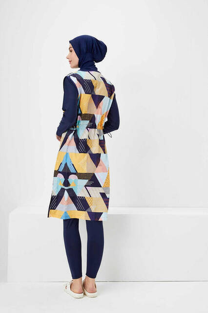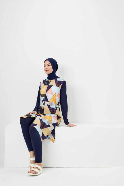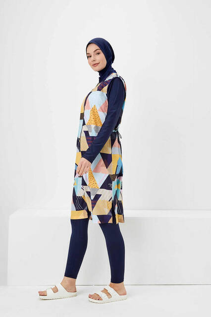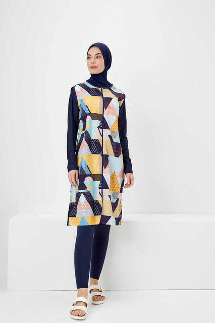 Haşema Nehar Renkli Geometrik Desenli Lacivert Tesettür Tam Kapalı Mayo Efide N-06-20