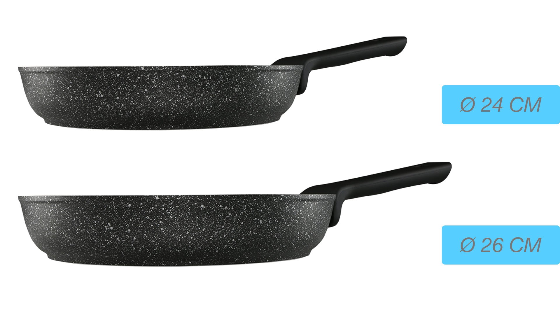 Lieferumfang und Abmessung: 1 x Duygu | 2er Pfannen-Set | Bratpfanne | Granit-Pfanne | 24 cm | 26 cm | Schwarz | Induktionsgeeignet | Duygu-Tava-Seti-2