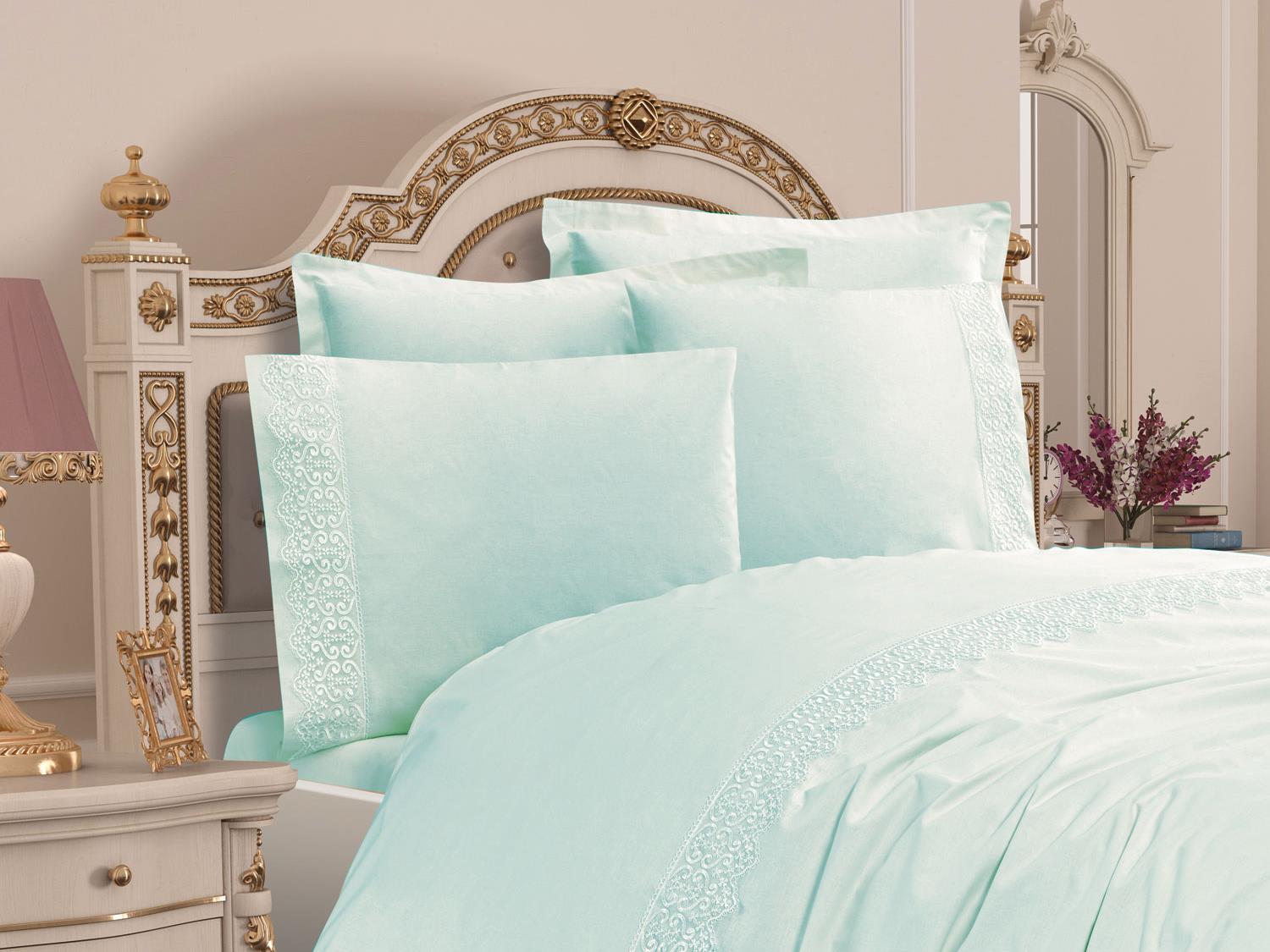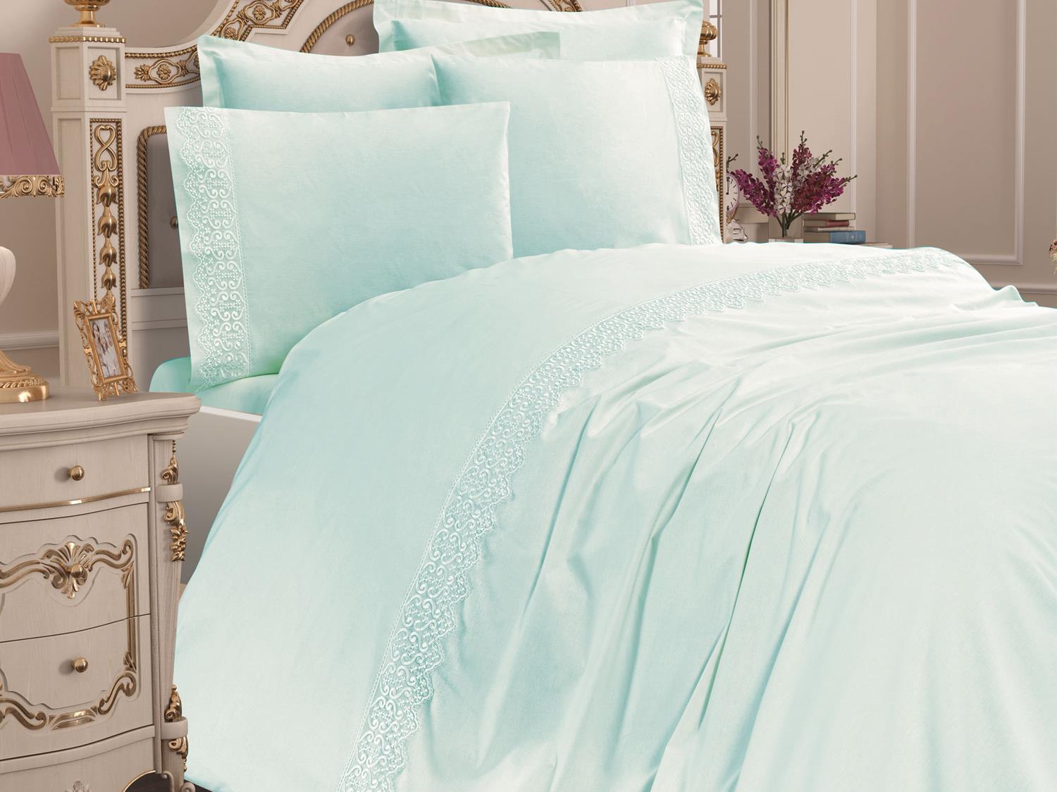 Hergestellt aus 100% Baumwolle. Ein besonderes Design wurde durch Aufnähen von French Guipure auf den Bettbezug geschaffen.