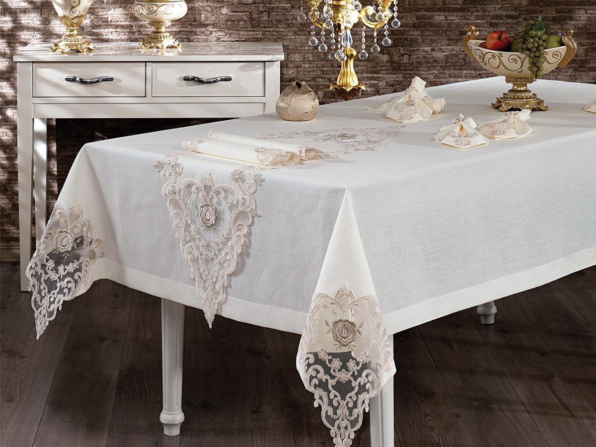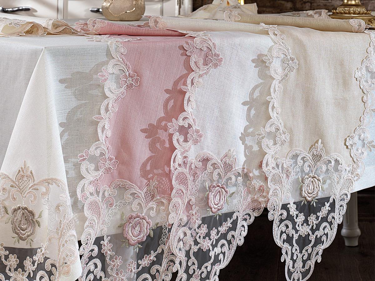 Aus schmutzabweisendem Leinen. Ein spezielles Design wurde geschaffen, indem die vier Seiten der Tischdecke dekoriert wurden und der Läufer mit French Stone Guipures endet.