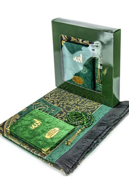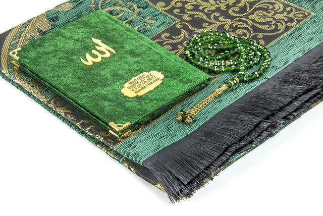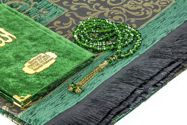 Produktinformationen "Hajj Umrah Mevlid Set 27 - Name gedruckt Samtbedeckt Yasin - Gebetsteppich - Rosenkranz - Boxed"