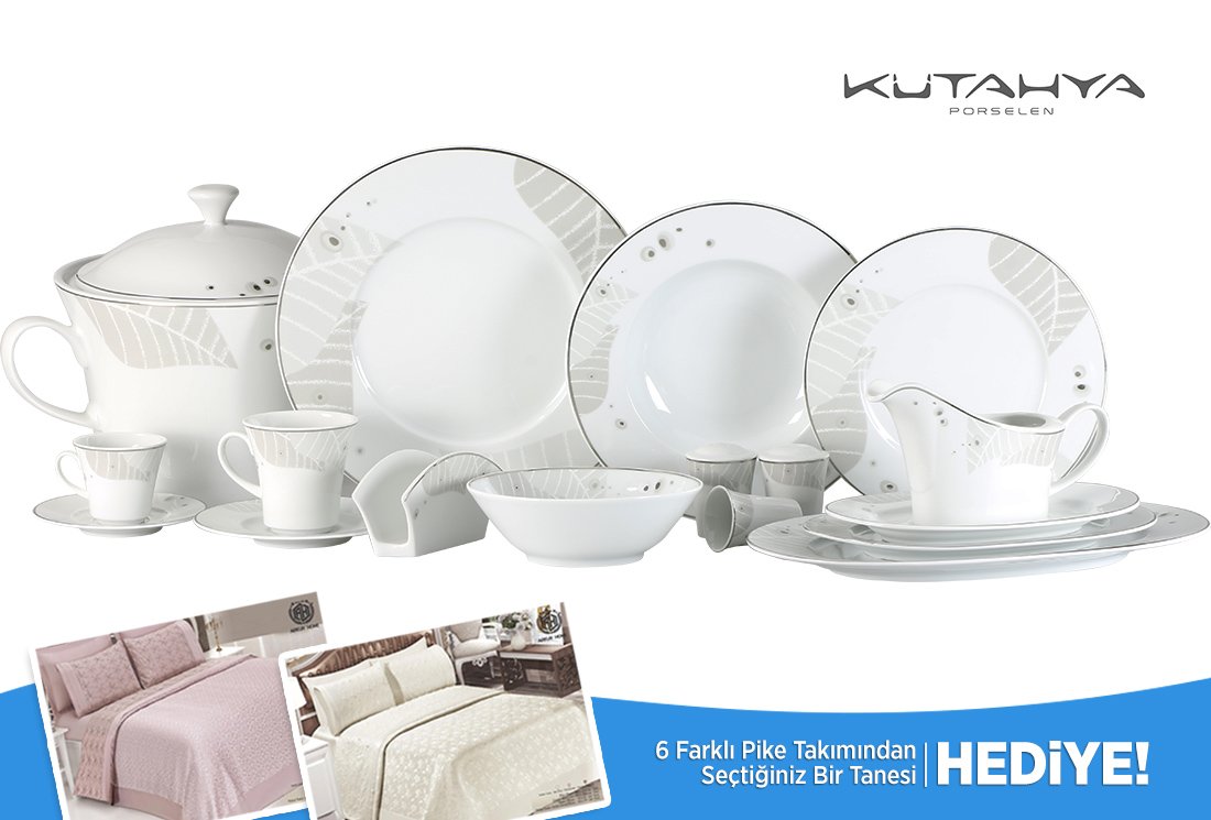 Lieferumfang und Abmessung: 1 x Kütahya Porzellan Iris 85 tlg Tafelservice für 12 Personen + Gratisartikel Arkur Home 6 tlg Tagesdecken Set | KTH-3032-KMP-AHC-0002