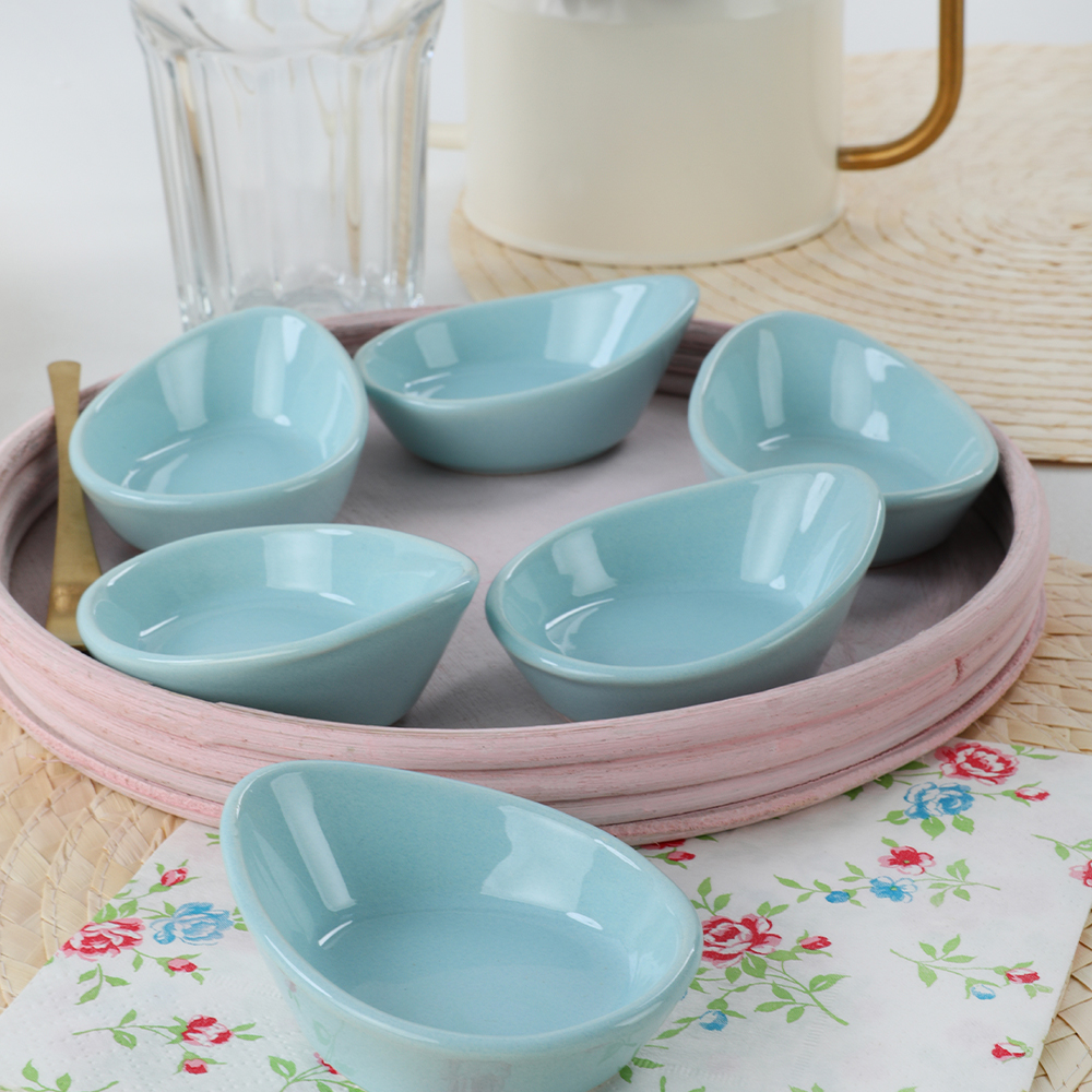 Keramika 6 offene türkisfarbene Minigondeln, die Sie bei einem einfachen Familienessen oder einer überfüllten Party begleiten, verleihen Ihrem Snack- / Soßen-Service eine sehr stilvolle Atmosphäre. Diese Produkte, die der Schlüssel für auffällige Präsentationen sind, verleihen Ihrem Tisch ein cooles Aussehen.