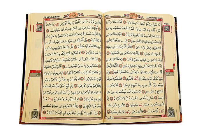 Dank der Sure-Titel und der Datenmatrix am Rand der Seite besteht die Möglichkeit, sowohl arabische als auch türkische Übersetzungen über Smartphones zu hören