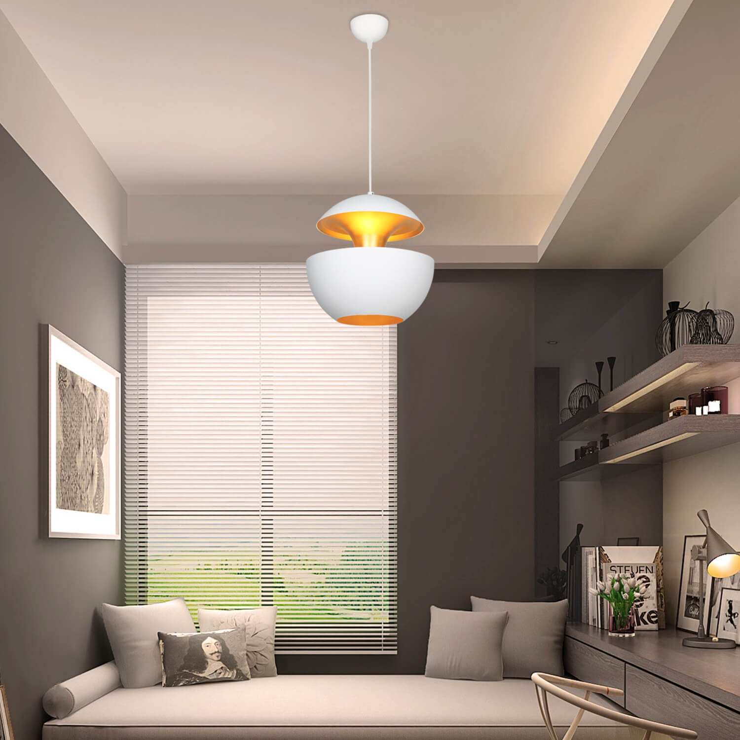 . Die "Mona White Pendelleuchte", die dank des mit elektrostatischer Farbe aufgebrachten Metallgehäuses ein anderes Design aufweist, verleiht der Umgebung, in der sie sich befindet, ein anderes Ambiente.