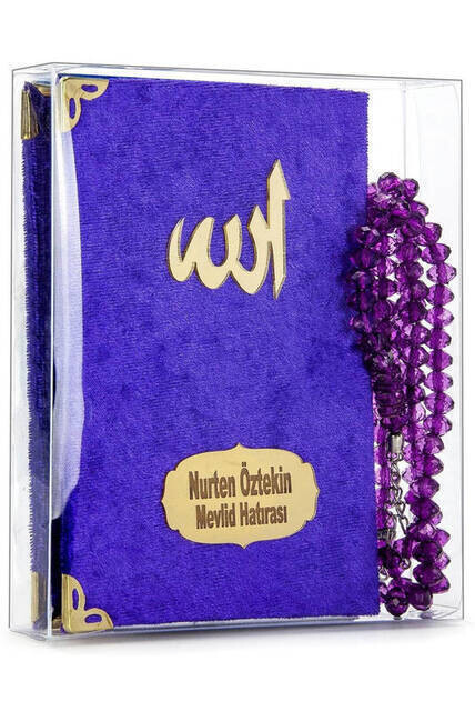 Samtbedecktes Yasin-Buch - Taschengröße - Name Spezialplatte - Rosenkranz - Boxed - Lila - Mevlüt Geschenk