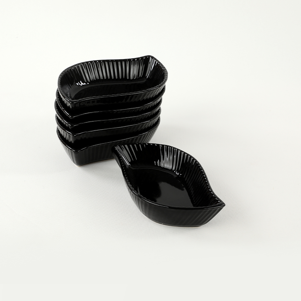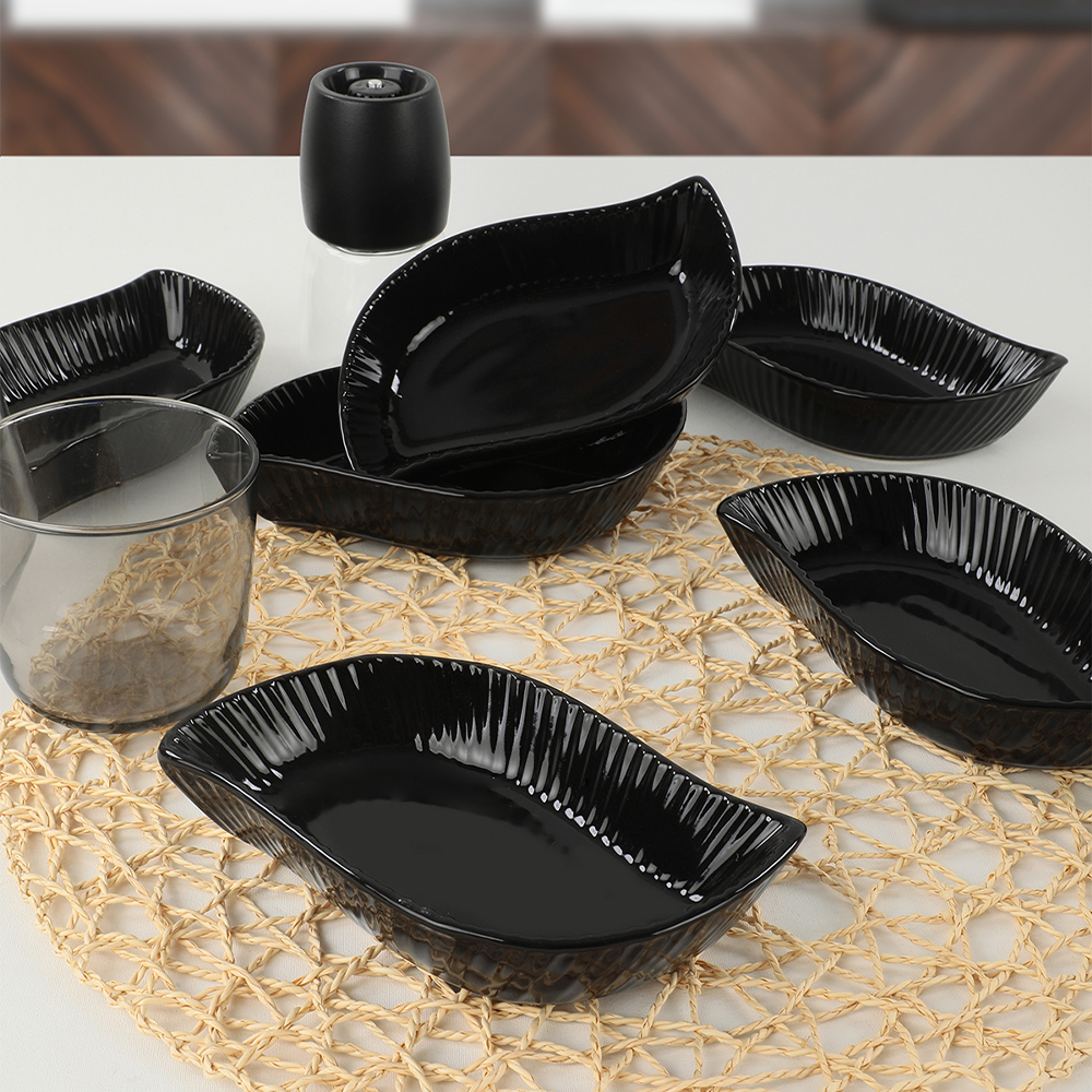 Keramika, die Sie bei einem einfachen Familienessen oder einer überfüllten Party begleitet, verleiht Ihrem Service mit 6 Black Leaf Relief-Snacks eine sehr stilvolle Atmosphäre. Diese Produkte, die der Schlüssel für auffällige Präsentationen sind, verleihen Ihrem Tisch ein cooles Aussehen.