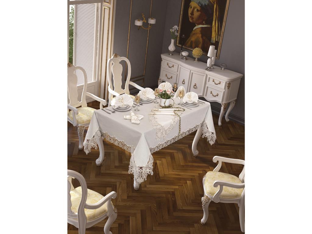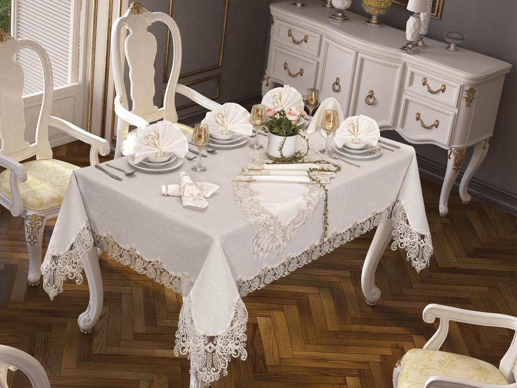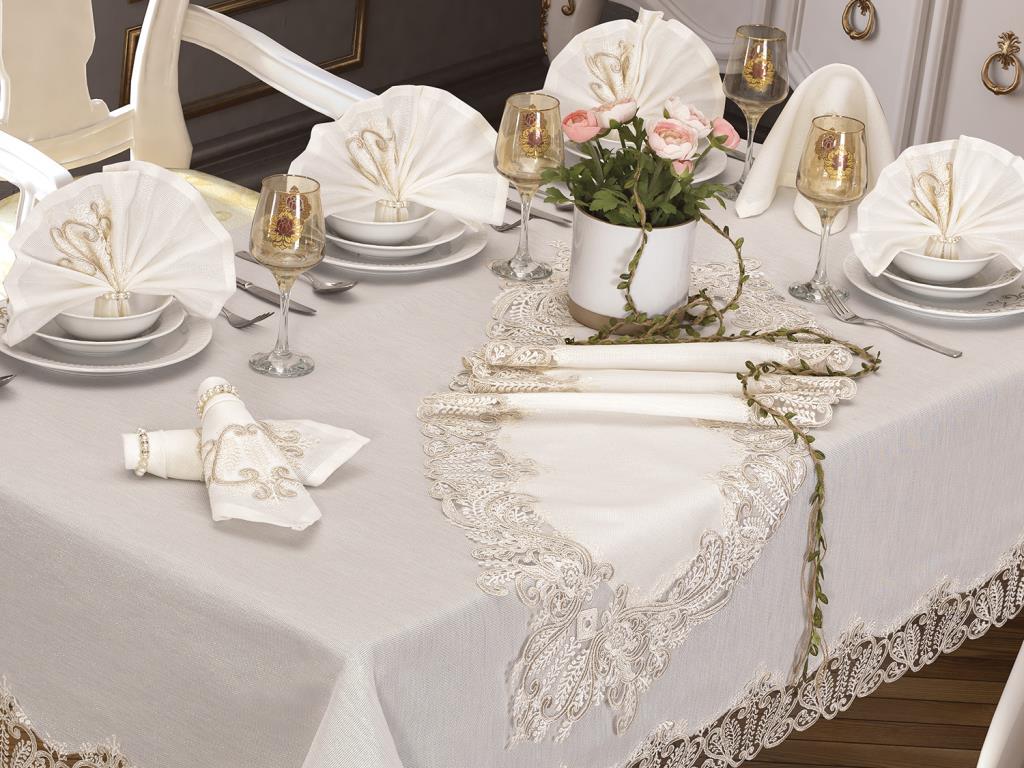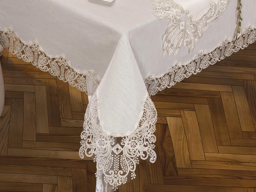 Ein spezielles Design wurde geschaffen, indem die vier Kreise der Tischdecke dekoriert wurden und die Runner-Enden mit French Stone Guipures.