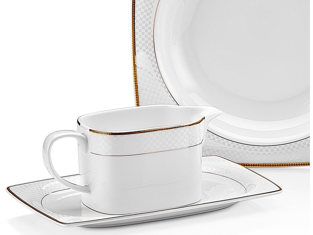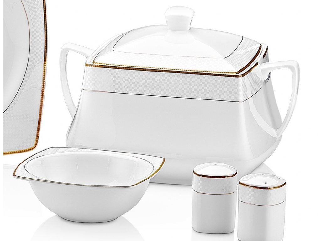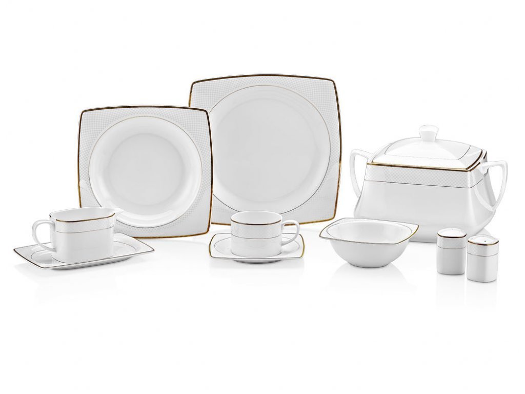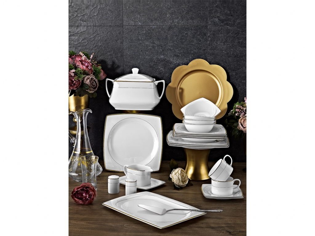 Tac Mühr-ü Sedef | Misra | 85 Teilig | Tafelservice | Teller-Set | Esservice | Tafel-Set | Bone Porzellan | Weiß | Karo | 12 Personen | Hochzeit | Verlobung | Geburtstag | Feier | Tac-2055
