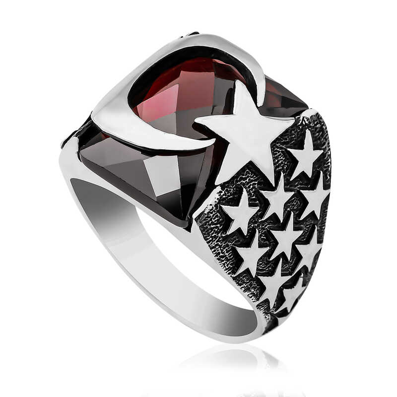 Crescent and star or crescent-star; ancient symbol consisting of a crescent and a star at the open end of the crescent. Flags using this symbol are mostly found around the Mediterranean, the Middle East and Central Asia. Today, it is mostly known as a symbol used on the flags of Islamic countries. The crescent-star symbol is on many flags, including the Turkish Flag. Although the Moon or Crescent is identified with the religion of Islam, it was also used in pre-Islamic times; Crescent-Star and Sun motifs have taken place in the pantheon of America, Europe, Anatolia, Middle East and Central Asia throughout history. BC in Central Asia. The Moon-Star and Sun motifs, which started from the rock paintings of the 5000s and were similarly depicted on later shaman drums, provide information about the universe design of the Asian Turkish-Mongolian peoples. But the first documents depicting the Moon and the Star together appeared in Mesopotamia in Sumerian cities in present-day Southern Iraq. The Sumerians were the first to use the Moon-Star motif, which consists of a clearly crescent in history. Sumerians, BC. They established the first state of history in Southern Iraq in 3000 BC and took a huge step in the construction of today's civilization. The Sumerian language was very close to Turkish. Their beliefs were also largely similar to the Turks. The symbols of the Sumerian Moon God “Nana-Suen” and the Sun God “Utu” or the Goddess Inana were shown together, making the first Crescent-Star duplication. This motif was sometimes embroidered on stone reliefs, sometimes on seals and sometimes on clay tablets, and has survived to the present day. Red cut stone crescent and star men's ring inspired by history; You can gift it to yourself or your loved ones on their birthday, father's day and special occasions. This stylish men's ring is made of 925 sterling silver. Oxide coating is made on silver. Oxide-plated rings have an authentic appearance. As with all men's rings, silver crescent and star men's rings are produced by hand. Due to silver and precious stones, there may be a deviation of ± 10% in the average product weight stated.