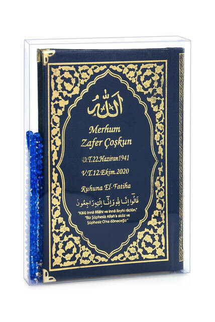 Hardcover Book of Yasin with Name Printed Classic Pattern Rosary Boxed Medium Size Dark Blue