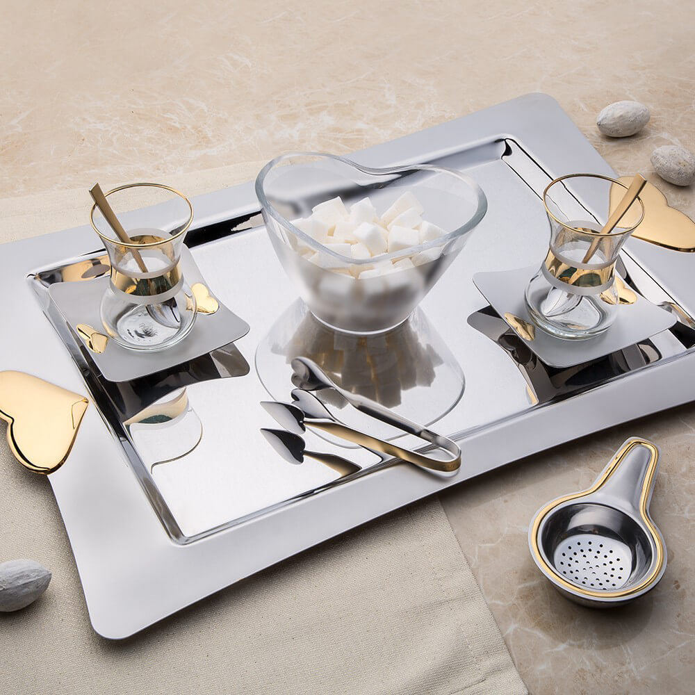 You can use the elegant Canan gold satin tea set both for your daily tea conversations and for your invitation tables. The matte satin surface of its tray and its mirror-like shiny steel are ideal for your inspiring presentations. We recommend hand washing as it is immersed in gold water.