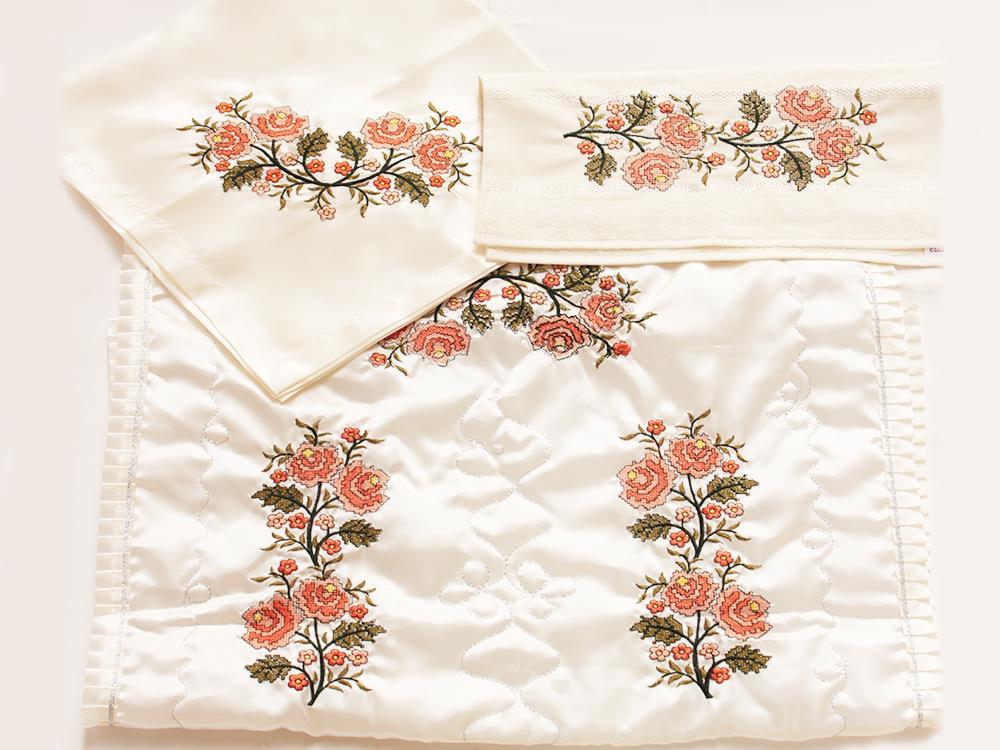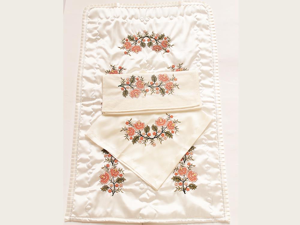 It is produced from satin fabric. A special design has been created with cross stitch embroidery.