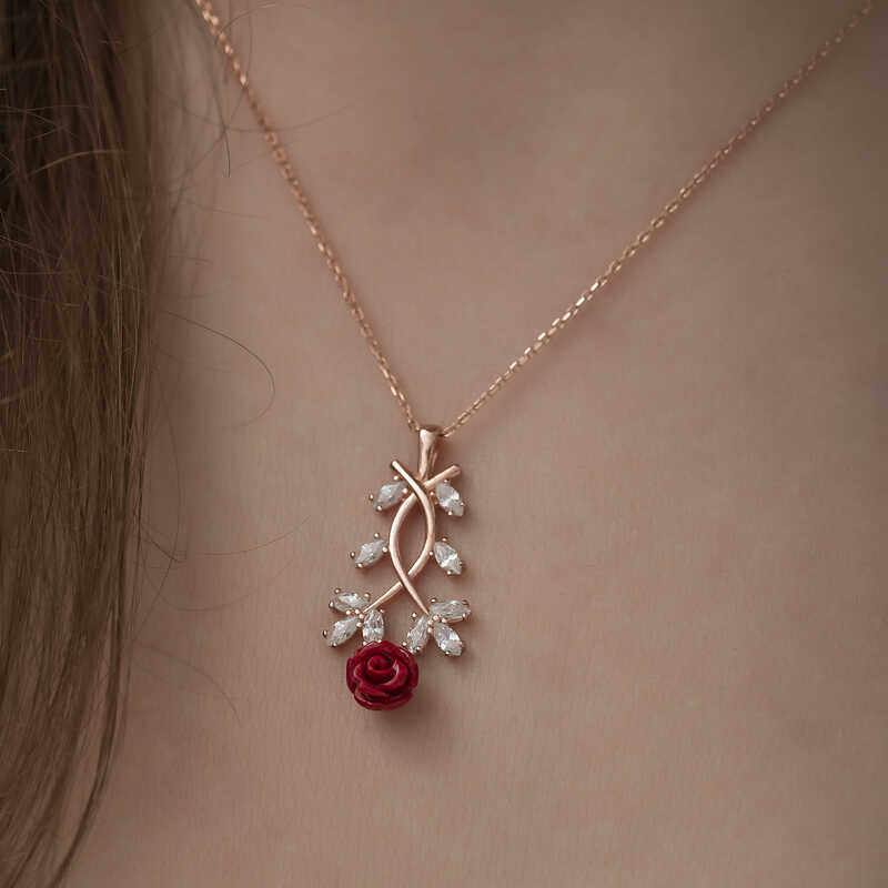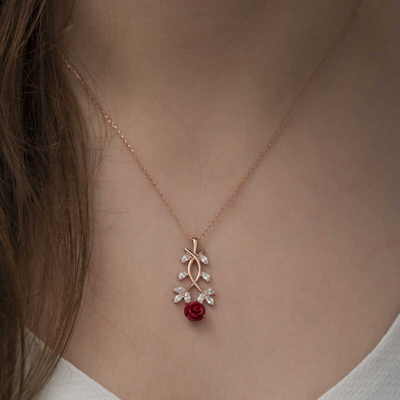 Havaların ısınmasıyla birlikte canlanan doğa, ilkbaharın geldiğini müjdeler. Yeşile bürünen ağaçlar, rengarenk çiçekler açar ve eşsiz kokuları ile bizi karşılar. Doğadan ilham alınarak tasarlanan bu kolye yeniden doğuşu ilkbaharı sembolize etmektedir. Bu şık kolye; doğum günü hediyesi, sevgililer günü veya özel günlerde tercih edilebilecek mükemmel bir seçenektir. Kolye; 925 ayar gümüşten imal edilmiştir. Gümüş üzerine rose altın kaplama yapılmıştır. Rose altın kaplama yapılan ürünler gümüşe pembe bakır rengi verir. Diğer kolyelerde olduğu gibi gümüş kırmızı gül kolye de el emeği ile üretilmiştir. Gümüş ve değerli taşlar nedeniyle belirtilen ortalama ürün ağırlığında ± %10 sapma olabilmektedir.