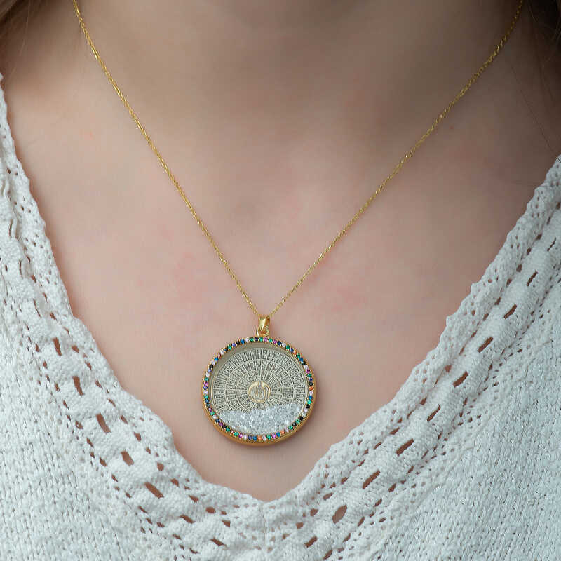 Esmaül Hüsna is the name given to the ninety-nine names of Allah, meaning the most beautiful names. This wonderful necklace with Esmaül Hüsna's inscription, frame and zircon stones is made of 925 sterling silver. Gold plated on silver. Gold-plated silver necklace models keep their shine for a long time. The necklace chain is also silver and its length is 45 cm. This special design necklace; It is a perfect option for special occasions as a birthday gift, Valentine's Day gift or as a gift for mothers. As with all our silver necklace models, the Esmaül Hüsna necklace model with silver mixed stones is produced by hand. There may be a deviation of ± 10% in the specified product weight due to silver and precious stones.