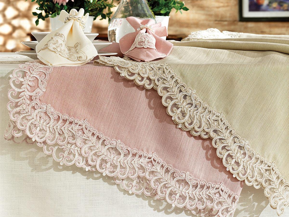 Made of Stain-Resistant Linen Fabric. A special design has been created by adorning the four sides of the table cloth and the runner ends with French Stone Guipures.