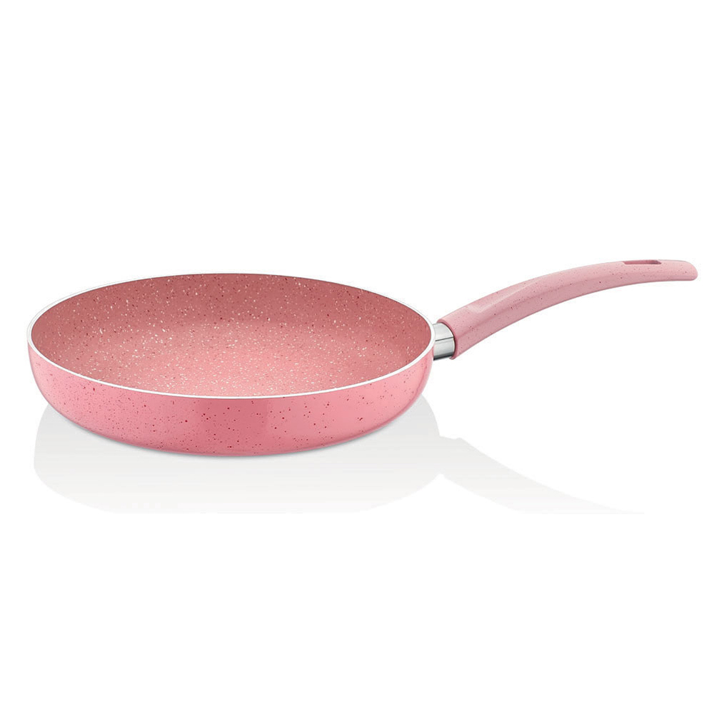 Ideal for making delicious and healthy meals with very little oil, the Polo Shef granite pink pan provides balanced heat and cooking thanks to its thick base. It has a double layer of granite, fireproof - non-stick surface specifically for the inner surface. This product, which has an ergonomic heat-resistant fireproof bakelite handle structure, has a non-flammable shiny silicone surface on an aluminum body.