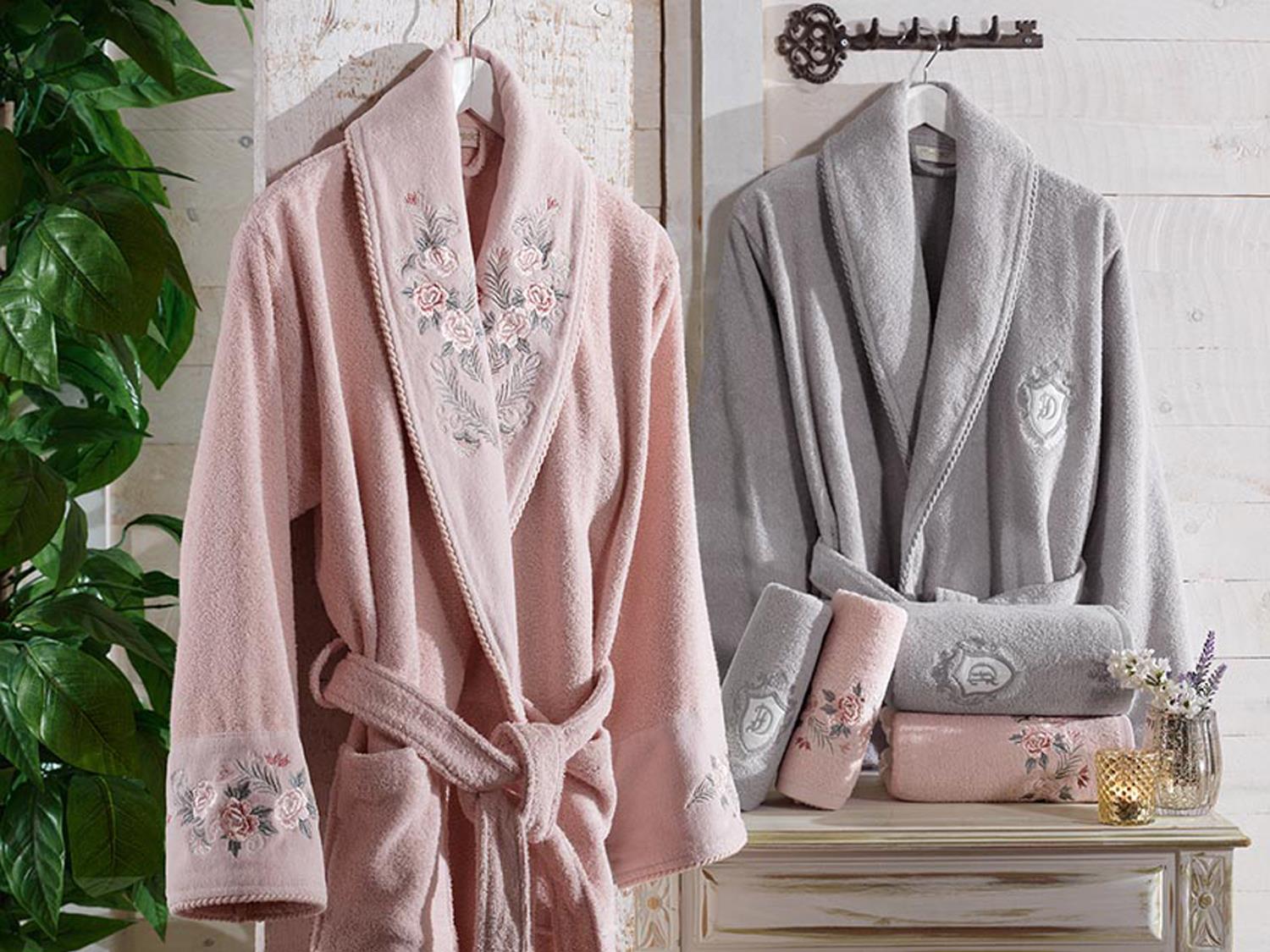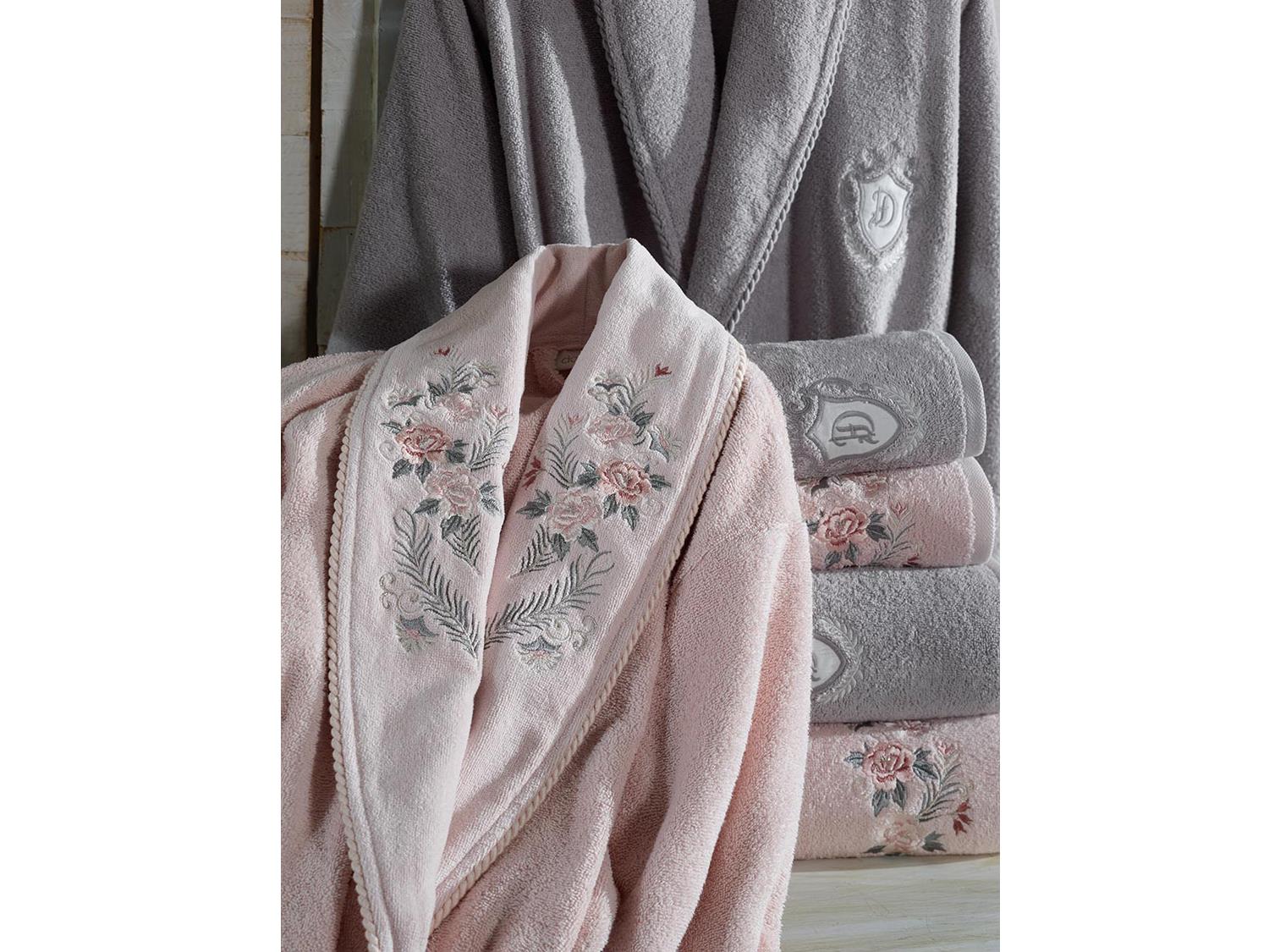 Larosa Lüks Nakışlı Pamuk Bornoz Takımı Pudra Gri | Dantela