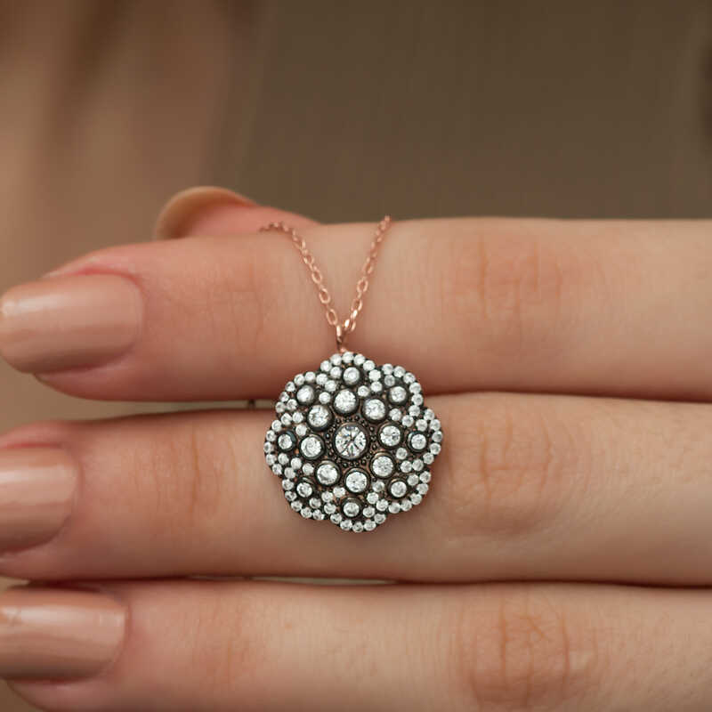 Silver diamond mount design necklaces that reflect the sparkle and flamboyance aim to add elegance to your elegance. Modernly designed silver diamond mounted flower pattern necklaces will highlight your feminine elegance. These necklaces are integrating with your beauty both in daily use and in special events, revealing eye-catching elegance. Diamond elegance continues to keep love, passion and vitality alive at all ages and everywhere. Beautiful silver necklaces, which arouse admiration with their flamboyance or highlight the feminine delicacy with their simple and elegant design, are waiting for you. Rose gold plated on silver. Rose gold plated silver women's necklace models keep their shine for a long time and their oxidation is delayed. The stones on the silver necklace model are zircon. The silver chain has an average length of 45 cm. This diamond mounted flower necklace is handcrafted. There may be a deviation of ± 10% in the specified product weight due to silver and precious stones.