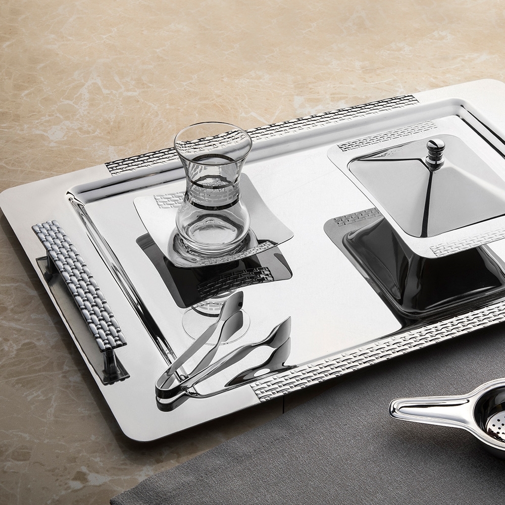 You can use the elegant Sırma tea set both for your daily tea conversations and for your invitation tables. The matte-looking satin surface of the wavy form tray and bright steel like mirror are ideal for your inspiring presentations. All parts of Sırma tea set can be washed in the dishwasher.