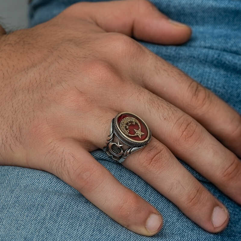 Crescent and star or crescent-star; ancient symbol consisting of a crescent and a star at the open end of the crescent. Flags using this symbol are mostly found around the Mediterranean, the Middle East and Central Asia. Today, it is mostly known as a symbol used on the flags of Islamic countries. The crescent-star symbol is on many flags, including the Turkish Flag. Although the Moon or Crescent is identified with the religion of Islam, it was also used in pre-Islamic times. Moon-Star and Sun motifs provide information about the universe design of Asian Turkish-Mongolian peoples. But the first documents depicting the Moon and the Star together appeared in Mesopotamia in Sumerian cities in present-day Southern Iraq. The Sumerians used the crescent-star motif for the first time in history. Sumerians, BC. They established the first state in history in Southern Iraq in 3000 BC and took a huge step in the construction of today's civilization. The Sumerian language was very close to Turkish. Their beliefs were also largely similar to the Turks. The symbols of the Sumerian Moon God “Nana-Suen” and the Sun God “Utu” or the Goddess Inana were shown together, making the first Crescent-Star duplication. This motif was sometimes embroidered on stone reliefs, sometimes on seals and sometimes on clay tablets, and has survived to the present day. This stylish ring; You can choose it as a birthday gift, valentine's day gift on special occasions. Silver Göktürk Turkish written crescent and star ring is made of 925 sterling silver. Oxide coating is made on silver. Oxide plated silver rings have an aged look. It is a red polyester coating on the crescent and star. Due to silver and precious stones, there may be a deviation of ± 10% in the average product weight stated.