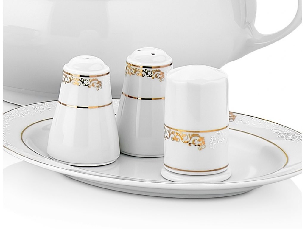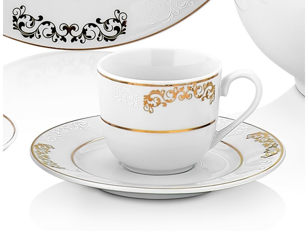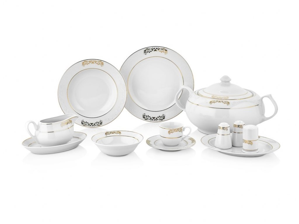 Crown Valery Sandor 85 Pieces Gold Dinner Set for 12 people contains whatever you are looking for on the table. It will be your biggest assistant with its wide content where you can easily host your guests. Each detail and pattern of carefully processed dinnerware adds beauty to your table. The nobility of gold color makes every meal special.