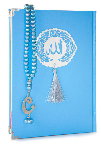 The Holy Quran - With Allah's Name - With Pearl Rosary - Plain Arabic - Blue Color - Silver Plexi - Computer Calligraphy