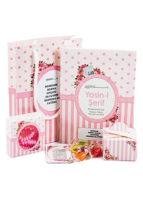 Set Yasin avec étiquette de nom - Taille du sac - 64 Pages - Chapelet - Aimant - Avec sucre - Couleur rose - Cadeau Mevlid