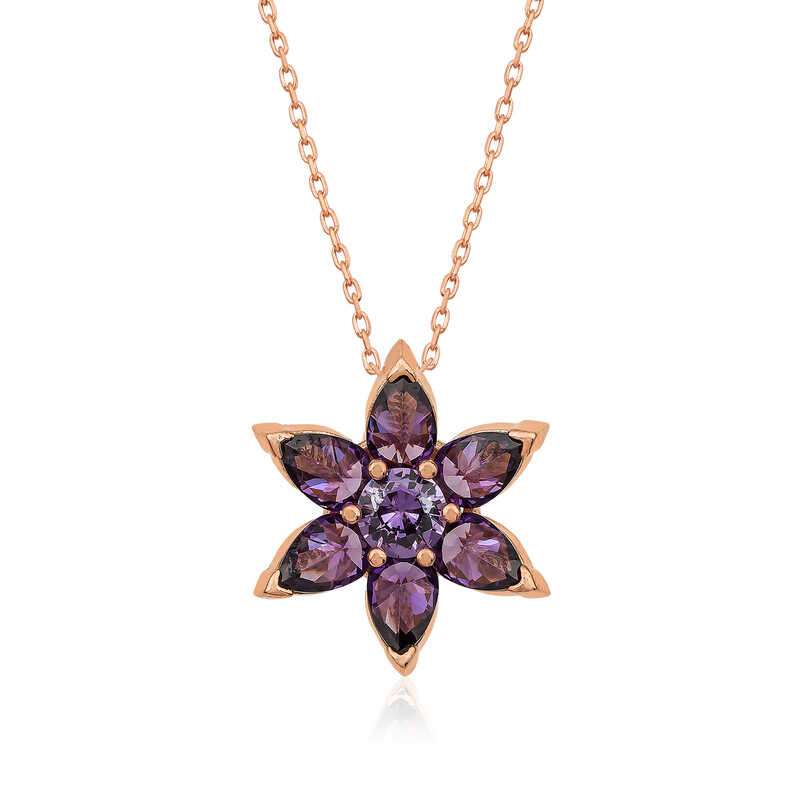 Pourquoi pas un collier élégant avec un motif floral pour exprimer vos sentiments à vos proches ? Ce collier élégant, qui fait partie des options de cadeau que vous pouvez lui envoyer à des moments spéciaux, est l'un des meilleurs moyens de faire plaisir à vos proches. Collier de dame à fleurs violettes en argent fabriqué avec des pierres de la plus haute qualité et les plus étincelantes; Il attend ceux qui veulent exprimer à nouveau leur amour, ceux qui veulent dire que tu es une fleur. Ce collier pour femme à fleurs violettes en argent au design spécial est en argent sterling 925. Plaqué or rose sur argent. Les modèles de colliers pour femme en argent plaqué or rose gardent leur éclat longtemps et leur oxydation est retardée. La chaîne en argent a une longueur moyenne de 45 cm. Comme pour tous les modèles de colliers en argent pour femmes, le collier fleur violette en argent est fabriqué à la main. Il peut y avoir un écart de ± 10 % dans le poids du produit spécifié en raison de l'argent et des pierres précieuses.