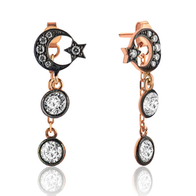 Türk bayrağının ilhamını da kan gölüne yansıyan ay ve yıldızdan aldığını biliyoruz. Bayrağın taşıdığı kutsal anlamı taşımak ve sevdiklerinizle paylaşmak için kaçırılmayacak bir fırsat sunuyoruz. 925 ayar gümüşten imal edilmiş olan bu ay yıldız bayan küpe üzerindeki taşlar zirkondur. Gümüş üzerine rose altın kaplama yapılmıştır. Rose altın kaplama yapılan tüm gümüş küpe modelleri parlaklığını uzun süre muhafaza eder, gümüşe pembe rengini verir, oksitlenmeyi geciktirir. Tüm gümüş küpe modellerimizde olduğu gibi gümüş sallantılı ay yıldız küpe modeli de el emeği ile üretilmiştir. Gümüş ve değerli taşlar nedeniyle belirtilen ortalama ürün ağırlığında ± %10 sapma olabilmektedir.