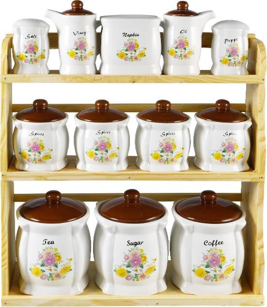 Livraison : 1x Bavary Lot de 12 pots à épices en porcelaine à motifs de fleurs avec support en bois - Blanc