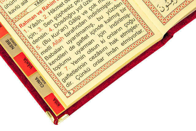 - Tous nos Yasins recouverts de velours sont équipés de barres d'angle de protection qui garantissent que les pages sont endommagées et que le tissu de velours recouvert reste stable.