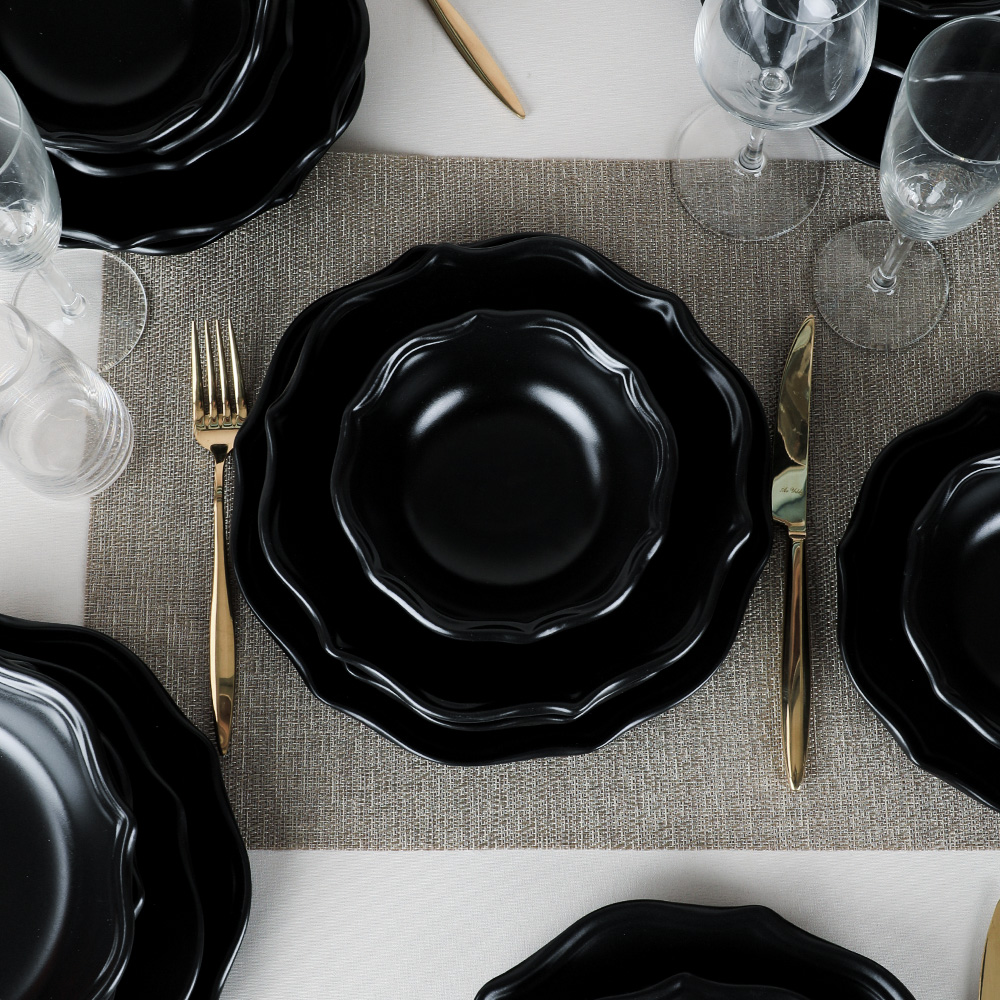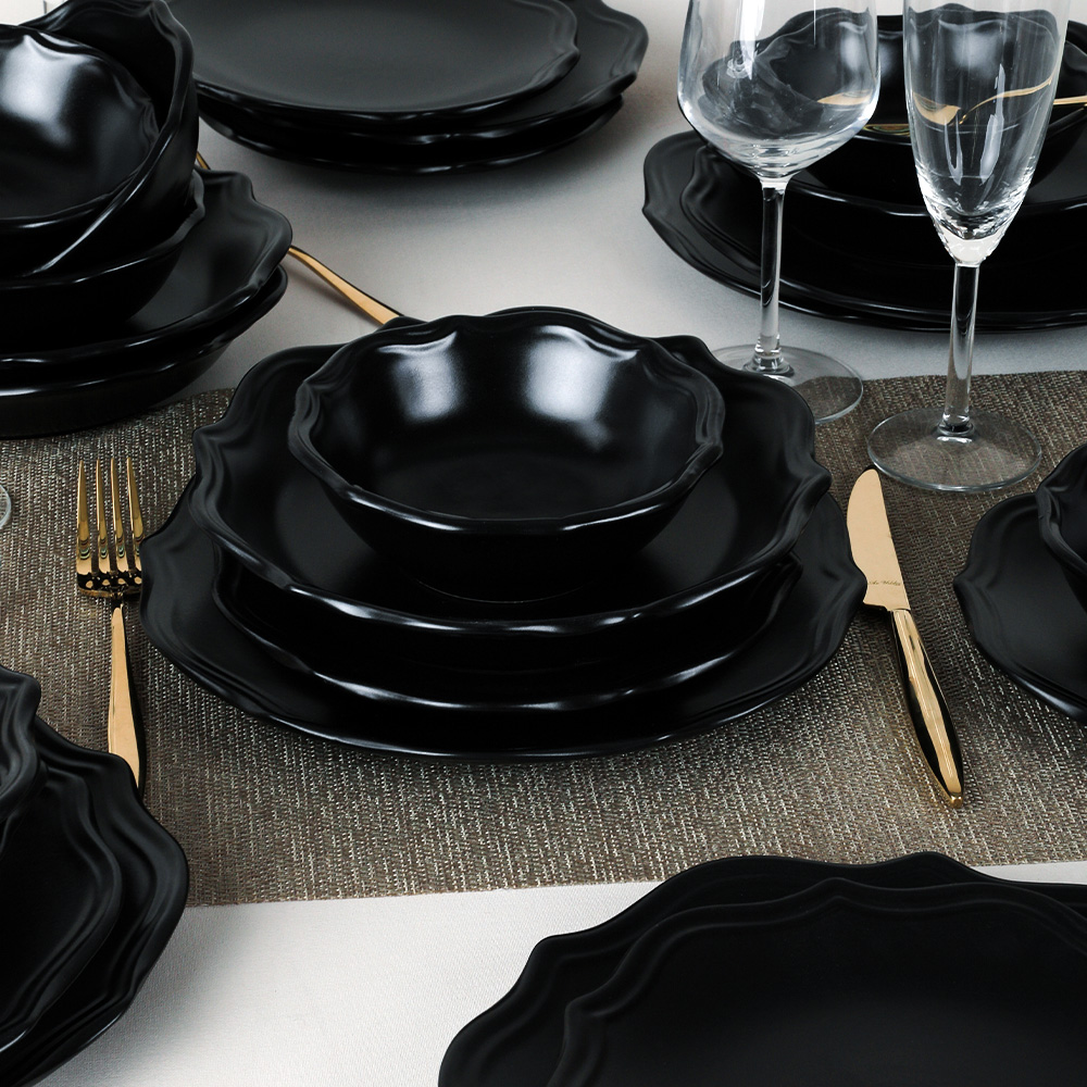 Conçu avec des formes modernes, l'ensemble de salle à manger romeo 6 personnes keramika est fabriqué avec soin en étant façonné par des mains habiles. Vous pouvez utiliser l'élégance et la structure utile du noir dans vos petits déjeuners et dîners élégants. Vous pouvez également choisir cette vaisselle qui fera en sorte que vos proches se sentent précieux comme un cadeau élégant.