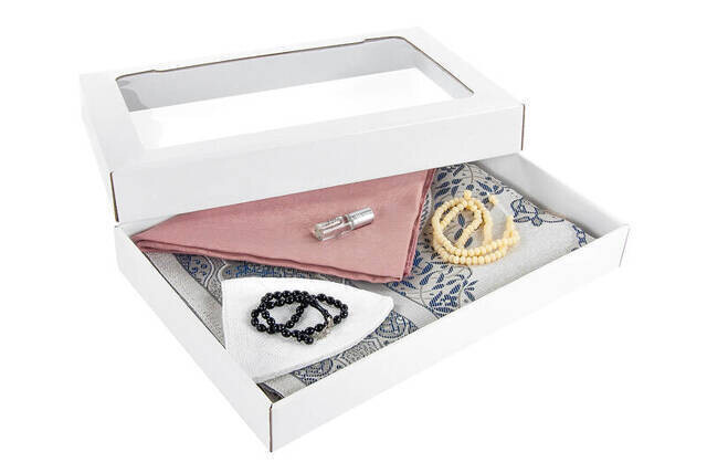 Contenu du coffret spécial Ramadan: 1 tapis de prière en taffetas ottoman de couleur claire...plus