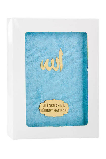 Informations sur le produit "Livre de Yasin recouvert de velours - taille du sac - plaque spéciale nom - boîte - couleur bleue - cadeau religieux islamique"